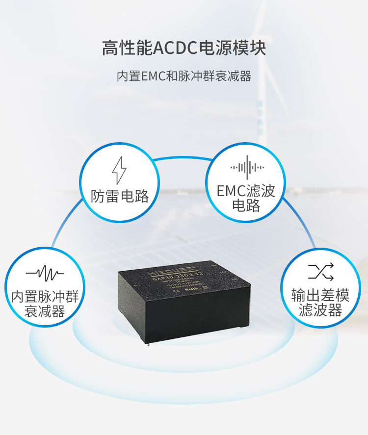 GAP系列—是HIECUBE為客戶提供的小型封裝形式的高性能模塊電源。該系列電源具有交直流兩用寬電壓輸入,內(nèi)置防雷防浪涌電路,內(nèi)置差模、共模濾波,效率高達(dá)83 %(全系列同步整流)。電源采用灌封封裝,具有防塵和防潮功能。本系列電源符合EN55032 Class B電磁兼容(EMC)特性和Class Ⅱ 隔離級(jí)別(安規(guī)),典型電路即可通過認(rèn)證測試。